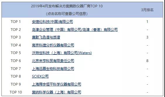 其中,只有3月榜單中的安捷倫、賽默飛、北京來(lái)亨3家公司繼續(xù)上榜,其余7家公司均淡出4月榜單。新上榜的7家公司中,4家國(guó)外儀器廠商,3家國(guó)內(nèi)儀器廠商。