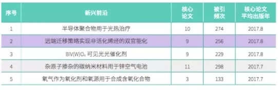 該領域共有5項研究入選新興前沿,主要涉及光催化劑、鋅空氣電池及半導體聚合物等材料類新興前沿和非活化烯烴的官能化及含氧化合物的合成等有機化學反應領域的新興前沿。