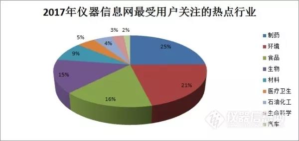 從數據可以看出,2017年儀器用戶關注的熱門領域仍在制藥、環境、食品三大行業,這與儀器信息網行業應用欄目解決方案的增長趨勢不謀而合。2017年,資訊欄目“制藥”關鍵詞出現2330次,“環境”出現2000次,“食品”出現1520次,其后分別是生物、材料、醫療衛生和石油化工等。